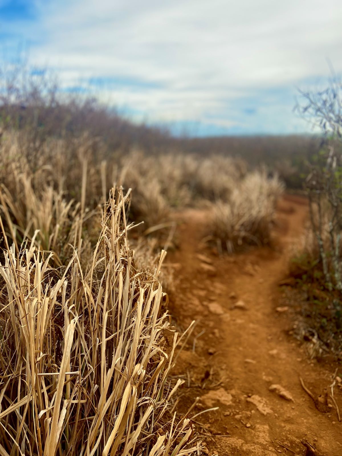 Soon I was off the golf course and entered a more covered trail with tall dry grasses and brush. The trail goes through a number of different terrains, which is one reason I enjoy it. I didn’t actually know where I was going. Walking in the red soil, I found my way to a vista point to gauge how far I was and texted Wade to let him know where I was. Along the way, I found several trucks parked near to the cliff edge. Some were camping, maybe for the day.