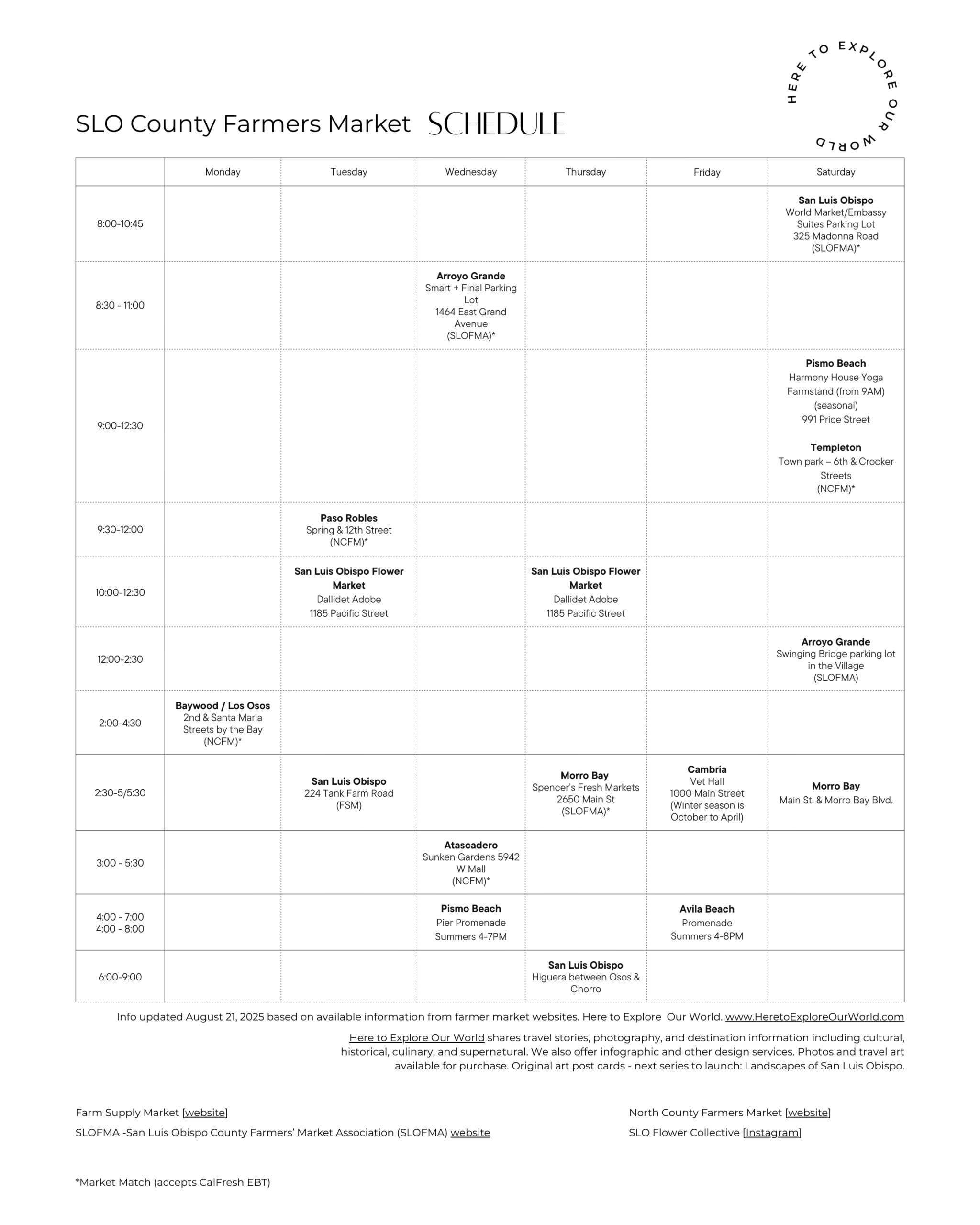 | 2:30PM – 5:30 (Winter season until 5PM)  | San Luis Obispo 224 Tank Farm Road (FSM)  | Morro Bay  Spencer’s Fresh Markets 2650 Main St (SLOFMA)  | Cambria Vet Hall 1000 Main Street (Winter season is October to April)  | Morro Bay Main St. & Morro Bay Blvd.  | |||